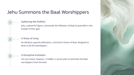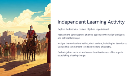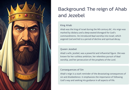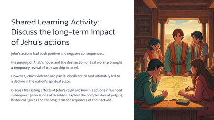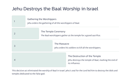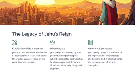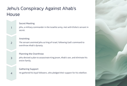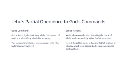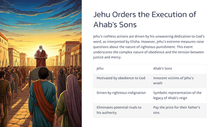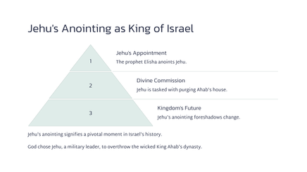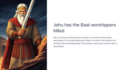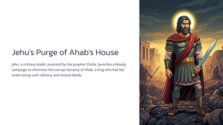 Jehu, ’n militêre leier wat deur die profeet Elisa gesalf is, loods ’n bloedige veldtog om die korrupte dinastie van Agab, ’n koning wat Israel op ’n dwaalspoor gelei het met afgodery en goddelose dade uit te skakel.
