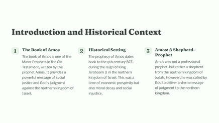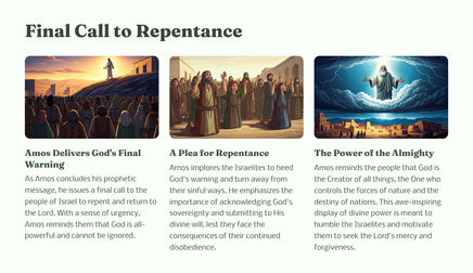 Amos, 'n herder van Tekoa, is deur God geroep om die morele en geestelike agteruitgang van die Noordelike Koninkryk te konfronteer. Deur 'n reeks oordele en waarskuwings spoor hy die mense aan om na die Here terug te keer en geregtigheid vir die verdruktes te soek.