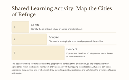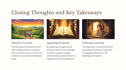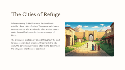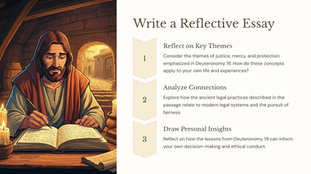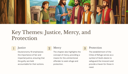In hierdie hoofstuk verskaf Moses leiding oor die stigting van toevlugstede en die hantering van regsaangeleenthede met regverdigheid en deernis. Die beginsels van geregtigheid en barmhartigheid is sentraal tot die handhawing van 'n regverdige samelewing.