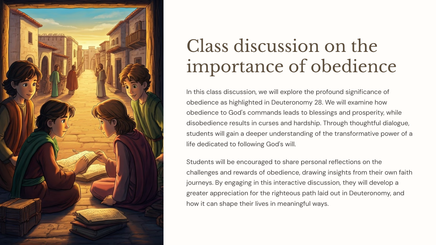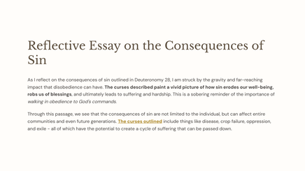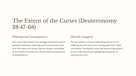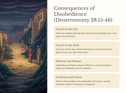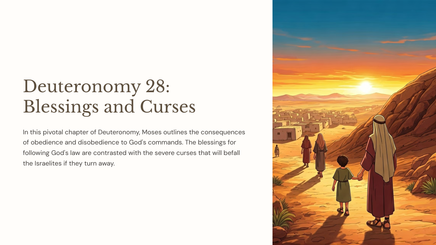 In hierdie deurslaggewende hoofstuk van Deuteronomium skets Moses die gevolge van gehoorsaamheid en ongehoorsaamheid aan God se opdragte. Die seëninge vir die nakoming van God se wet word gekontrasteer met die erge vloeke wat die Israeliete sal tref as hulle wegdraai.
