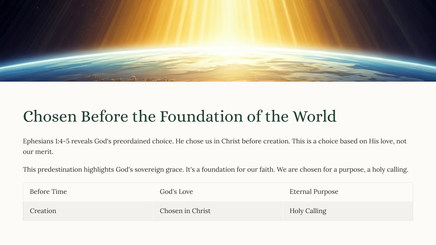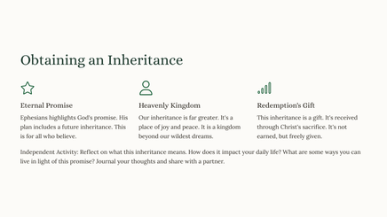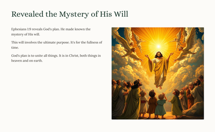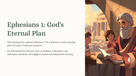 Hierdie onderrigeenheid verken Efesiërs 1. Ons sal God se wonderlike plan ontdek. Dit is 'n plan van verlossing en genade.