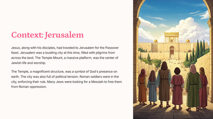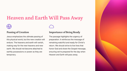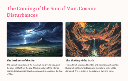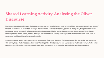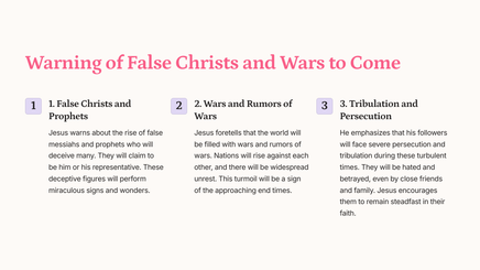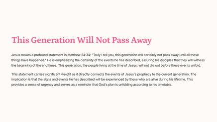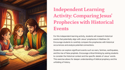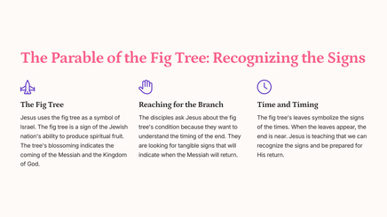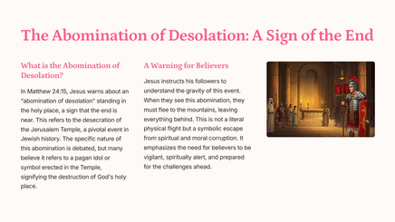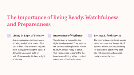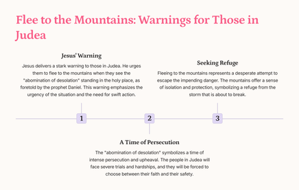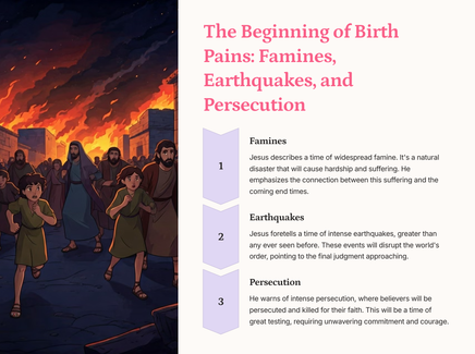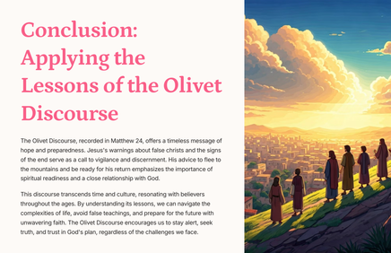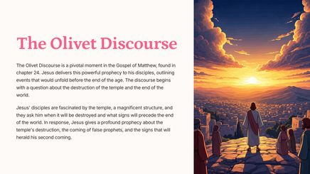 Jesus se dissipels is gefassineer deur die tempel, 'n manjifieke struktuur, en hulle vra hom wanneer dit vernietig sal word en watter tekens die einde van die wêreld sal voorafgaan. In reaksie hierop gee Jesus 'n diepgaande profesie oor die tempel se vernietiging, die koms van valse profete en die tekens wat sy wederkoms sal aankondig.