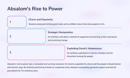 Gain insights into the biblical story of Absalom's rebellion with this educational and informative book. Written from a professional and objective perspective, it offers valuable lessons from 2 Samuel 15 that can be applied to modern day situations. Discover the power of forgiveness and the dangers of rebellion through this expertly crafted narrative.