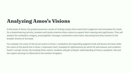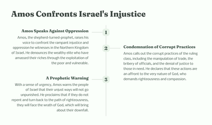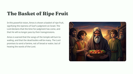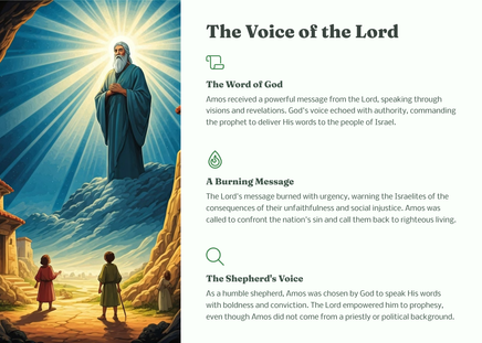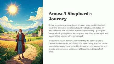 In the ancient land of Israel, a humble shepherd named Amos was chosen by God to deliver a powerful message to the people. This shepherd-turned-prophet would become a beacon of truth, challenging the status quo and calling for repentance in a time of moral decay.