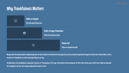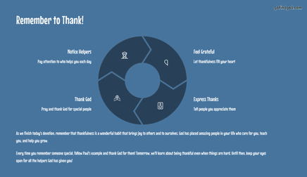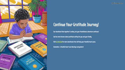 In Day 4 of the Grateful Hearts series, children are reminded that even when life is hard or disappointing, God is still close and worthy of our thanks. Based on Psalm 34:1, this devotion helps kids learn how gratitude can shine through tough moments and bring peace in their hearts.
