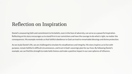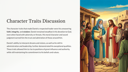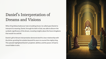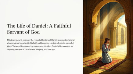 This teaching unit explores the remarkable story of Daniel, a young Jewish man who remained steadfast in his faith and became a trusted advisor to powerful kings. Through his unwavering commitment to God, Daniel's life serves as an inspiring example of faithfulness, integrity, and courage.
