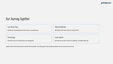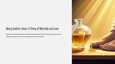 In this gentle and meaningful lesson, students will explore the beautiful story of Mary anointing Jesus' feet with perfume (John 12:1–8). Through hands-on activities, visual storytelling, and reflection, children will learn about the importance of expressing love and gratitude to Jesus in heartfelt ways.