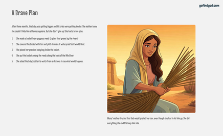 Introduce your Grade 4 students to God’s purpose and protection with this engaging Bible lesson focused on the story of Baby Moses. Through Exodus 2:1–10, children will explore how God was at work even in dangerous circumstances, preparing Moses for something greater. With hands-on learning, reflection questions, and a meaningful craft, this lesson invites students to discover how God watches over them, too.