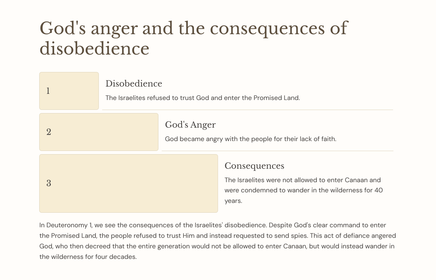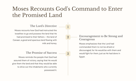Deuteronomy 1 is the opening chapter of the fifth book of the Bible, which recounts the Israelites' preparations to enter the Promised Land under the leadership of Moses. This section sets the stage for the laws and instructions that follow in the rest of the book.