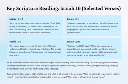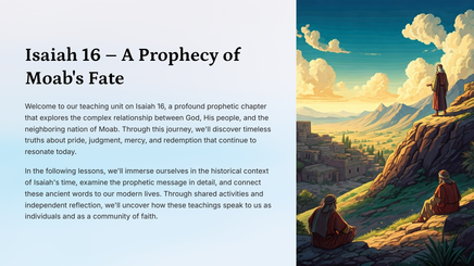 Welcome to our teaching unit on Isaiah 16, a profound prophetic chapter that explores the complex relationship between God, His people, and the neighboring nation of Moab. Through this journey, we'll discover timeless truths about pride, judgment, mercy, and redemption that continue to resonate today.