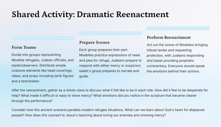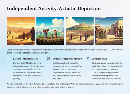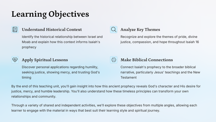 In the following lessons, we'll immerse ourselves in the historical context of Isaiah's time, examine the prophetic message in detail, and connect these ancient words to our modern lives. Through shared activities and independent reflection, we'll uncover how these teachings speak to us as individuals and as a community of faith.