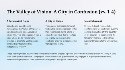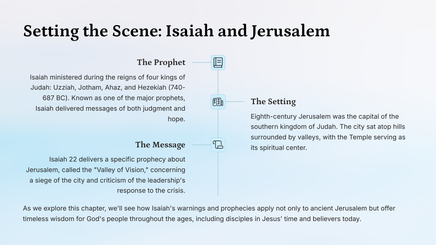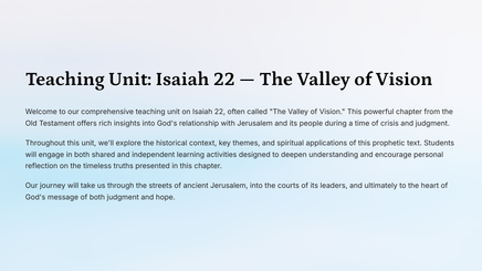 Welcome to this exploration of Isaiah 22, known as the "Valley of Vision." Throughout this teaching unit, we'll journey through this profound prophetic text, examining its historical context, theological significance, and relevance for contemporary spiritual life.