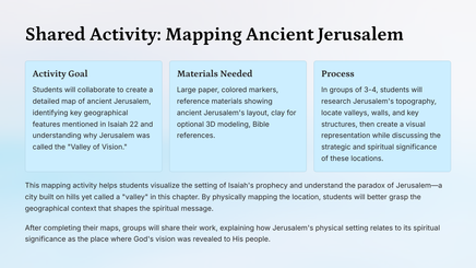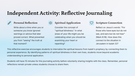 Our journey will include both collaborative learning experiences and opportunities for independent reflection. Each section features engaging activities designed to deepen your understanding of Isaiah's message and its application to our lives today.