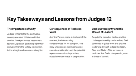 In this chapter, we explore the consequences of conflict, examining the events that follow the death of Jephthah and the rise of the Gileadites. Prepare to delve into the complexities of leadership, tribal rivalry, and the lasting impact of choices.