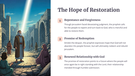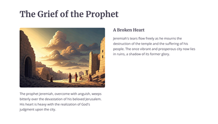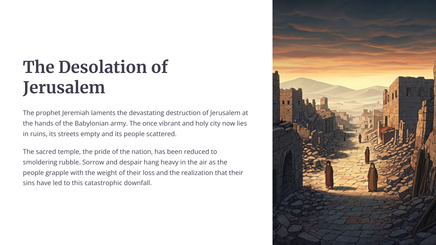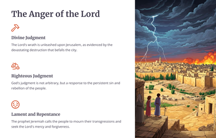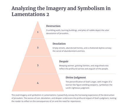 Lamentations 2 expresses the prophet's anguish over the destruction of Jerusalem and the suffering of the people. It is a heartfelt plea for God's compassion and restoration in the midst of profound grief and despair.