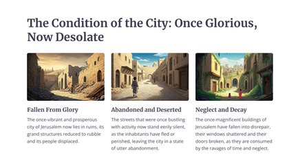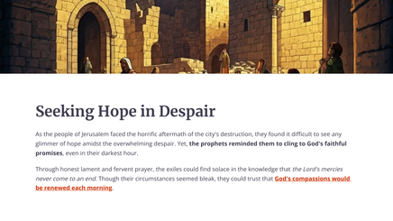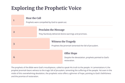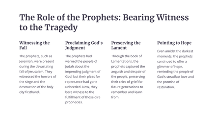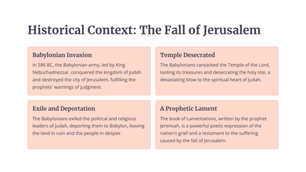 The book of Lamentations contains a powerful and emotional prophetic cry over the destruction of Jerusalem by the Babylonians. This chapter explores the profound suffering and sorrow experienced by the people as a result of their sin and God's judgment.