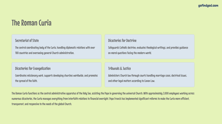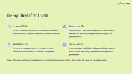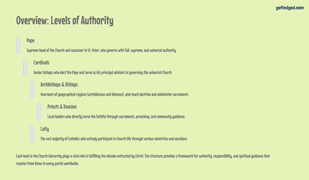 The Catholic Church operates through a carefully organized system of leadership, with distinct roles from the Pope at the summit to the laity forming the foundation. This lesson will guide you through each level of authority, helping you understand how these various roles work together to maintain the Church's missio