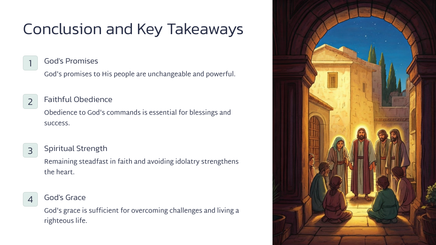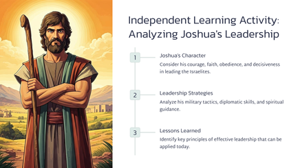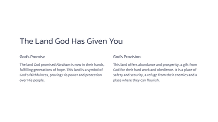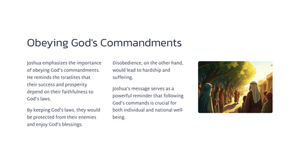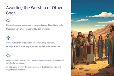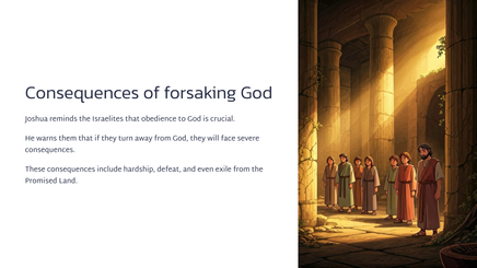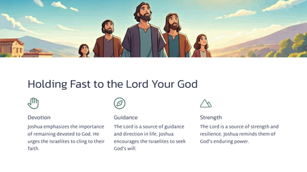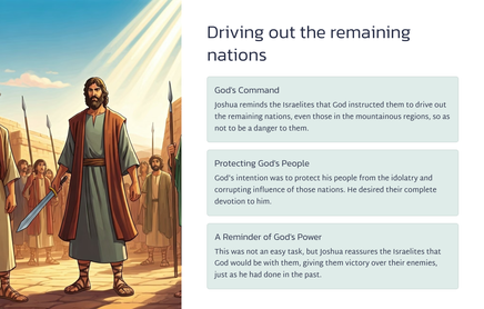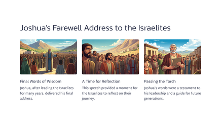 Joshua gathers the Israelite leaders. He's getting old and his time is nearing its end. He knows it's time for them to move forward on their own. He reminds them of all that God has done for them. He implores them to remain faithful and obey God's commands.