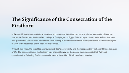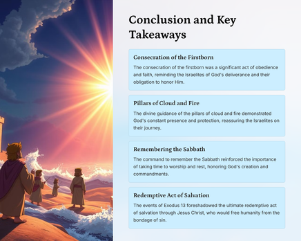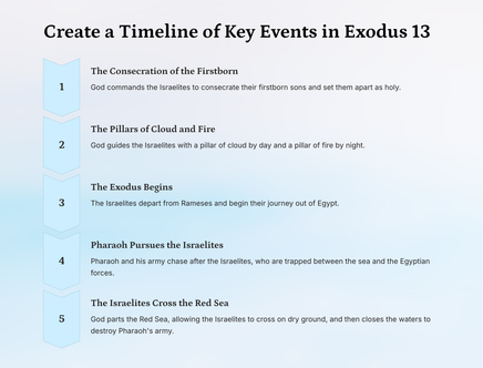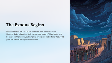 Exodus 13 marks the start of the Israelites' journey out of Egypt, following God's miraculous deliverance from slavery. This chapter sets the stage for the Exodus, outlining key events and instructions that would guide the people through the wilderness.