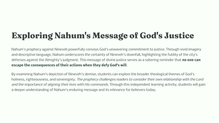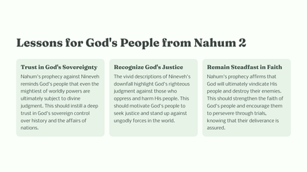Nahum's prophecy serves as a warning to those who defy God and oppress his people. The chapter emphasizes God's sovereignty, justice, and the inevitability of his judgment against unrepentant sin. As we study this passage, we are reminded of the consequences of rebellion against the Almighty and the importance of turning to Him with humility and obedience.