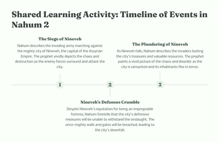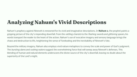 In this chapter, the prophet Nahum vividly describes the coming judgment and destruction of the great city of Nineveh, the capital of the Assyrian Empire. The imagery is powerful, depicting the siege, the chaos, and the ultimate downfall of this once-mighty city.