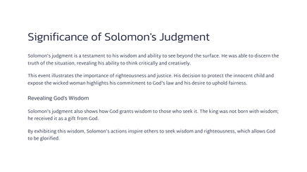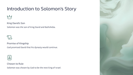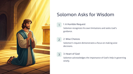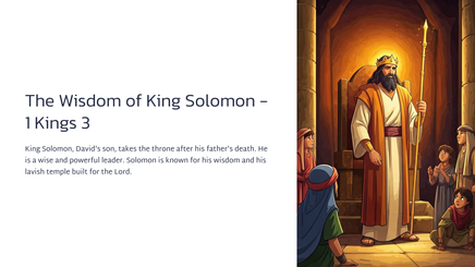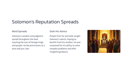 This chapter details the beginning of Solomon's reign, after the passing of his father, King David. King Solomon ruled over a vast and powerful kingdom, building his throne upon the strength and wisdom of David's legacy.