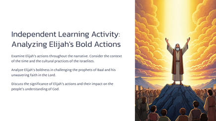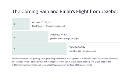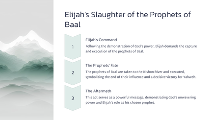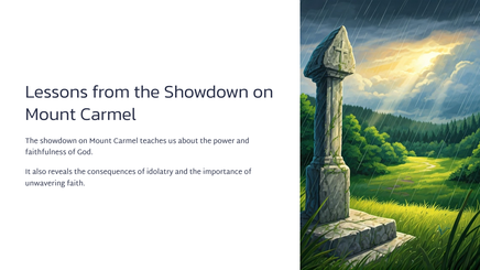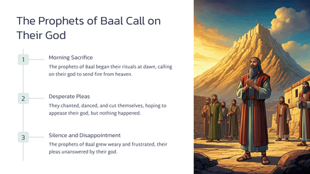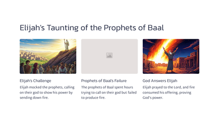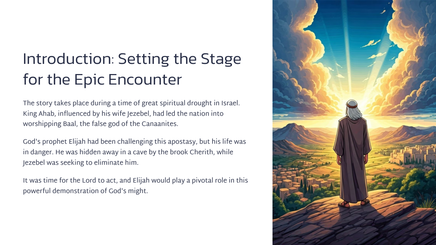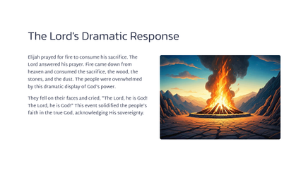 This story recounts the dramatic confrontation between the prophet Elijah and the prophets of Baal on Mount Carmel. It's a pivotal moment in Israel's history, highlighting the struggle between true faith and idolatry.