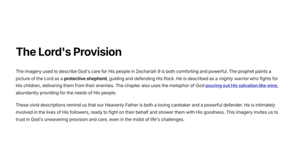 In this chapter, the prophet Zechariah delivers a message of hope and restoration from God to the people of Judah. He encourages them to turn to the Lord for guidance and strength, promising that He will renew their fortunes and bring them back to their land.