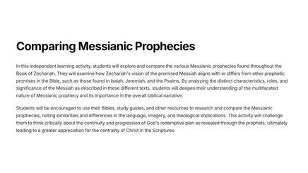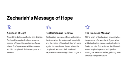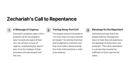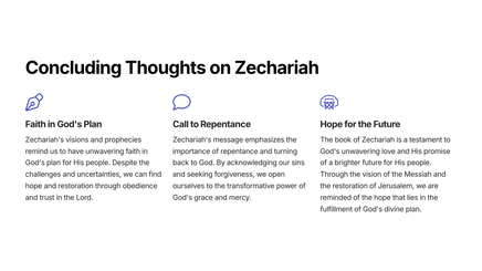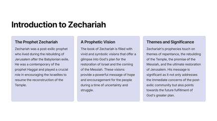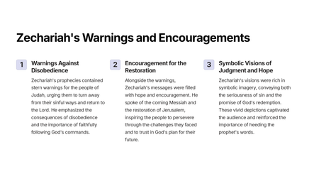 The Book of Zechariah is a powerful and insightful prophetic text that reveals God's plan for the restoration of Jerusalem and the establishment of His eternal kingdom. Through a series of vivid visions and symbolic imagery, the prophet Zechariah provides a glimpse into the future and the ultimate triumph of God's people.