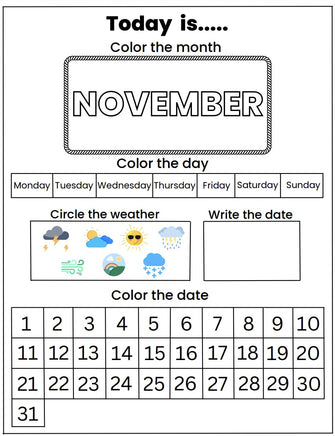 • Color the day and date – Develop fine motor skills while learning calendar sequencing.