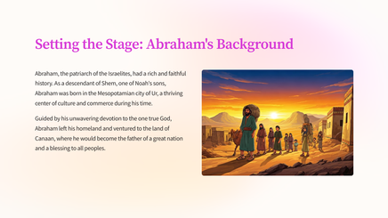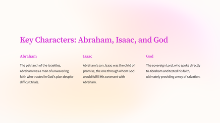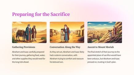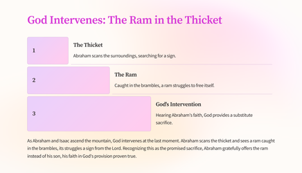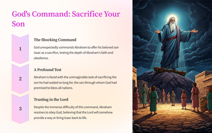 This pivotal biblical narrative explores the profound test of faith experienced by Abraham, as he is commanded by God to sacrifice his beloved son, Isaac. This challenging episode reveals the depth of Abraham's unwavering devotion and the divine providence that ultimately spares Isaac's life.