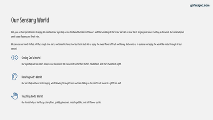 Students engage with God's creation through interactive storytelling, sensory exploration stations, and meaningful discussions about how everything in the world reflects God's goodness.
