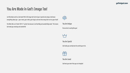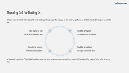 “Thank You, God, for making me special. Thank You for my eyes, my hands, and my smile. Help me remember that You made me in Your image, and You love me just the way I am. Amen.”