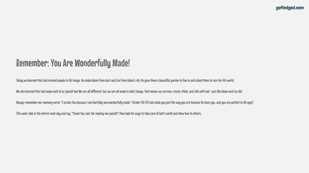 Memory Verse: “I praise You because I am fearfully and wonderfully made.” – Psalm 139:14a