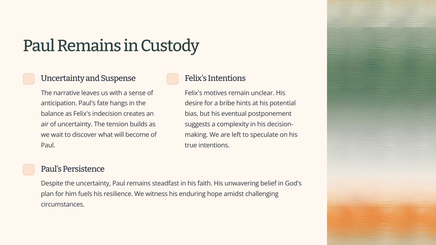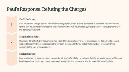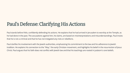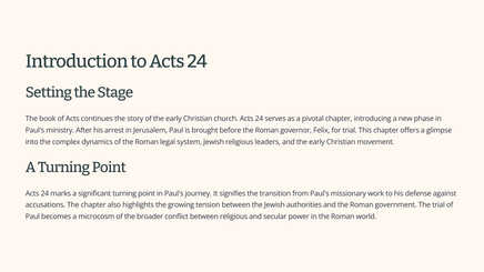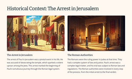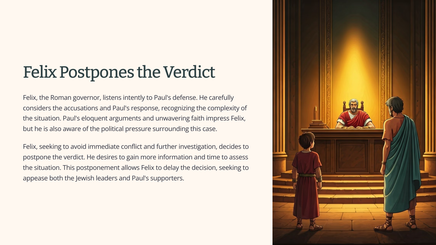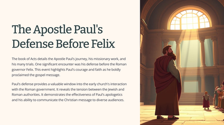 The book of Acts details the Apostle Paul's journey, his missionary work, and his many trials. One significant encounter was his defense before the Roman governor Felix. This event highlights Paul's courage and faith as he boldly proclaimed the gospel message.