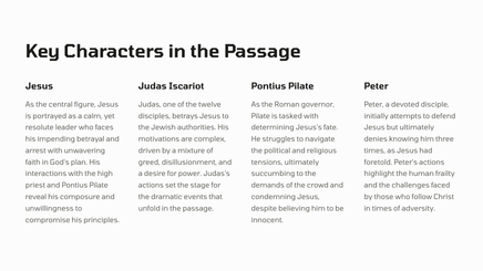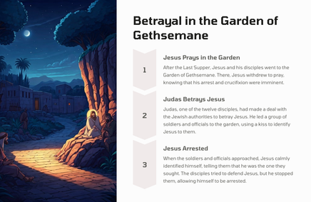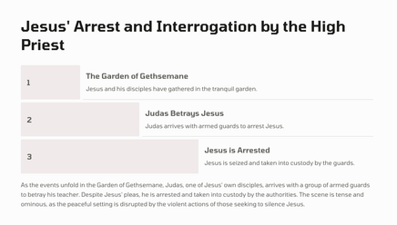 In the Garden of Gethsemane, Jesus is betrayed by Judas and arrested by the authorities. The disciples try to defend him, but Jesus calmly submits to the arrest, knowing that it is part of God's plan. He is then taken before the Jewish leaders and the Roman governor, Pontius Pilate, where he faces a trial and is ultimately condemned to death.