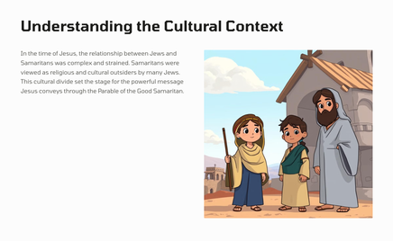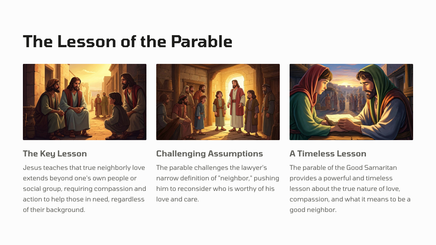 In this well-known parable, Jesus tells the story of a man who is attacked and left for dead on the road. The response of the religious leaders contrasts sharply with that of a Samaritan traveler, who stops to provide compassionate aid.