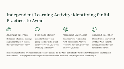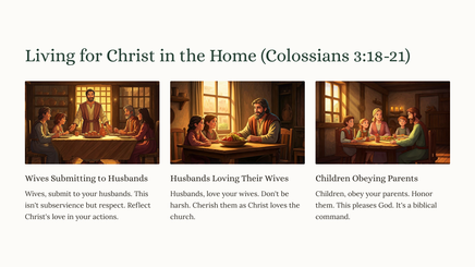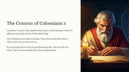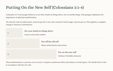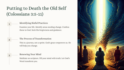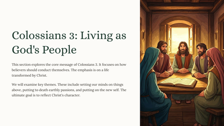We will examine key themes. These include setting our minds on things above, putting to death earthly passions, and putting on the new self. The ultimate goal is to reflect Christ's character.