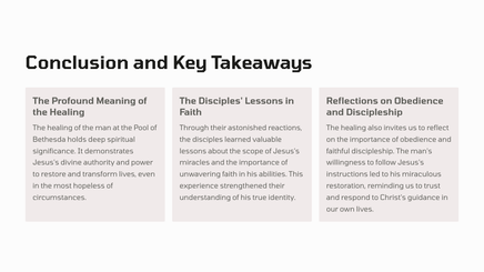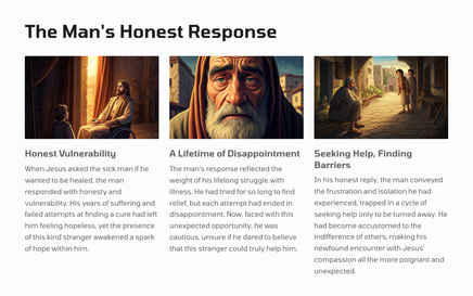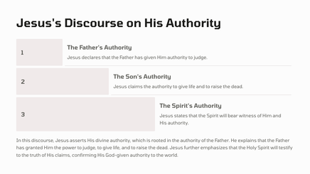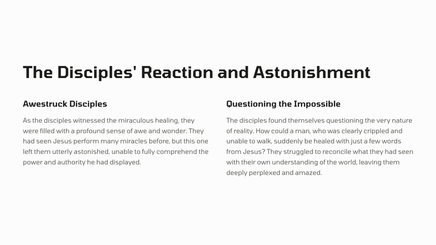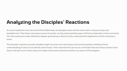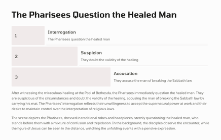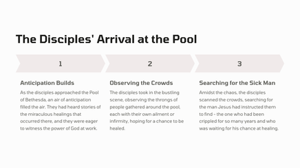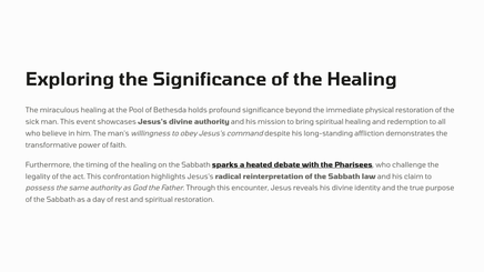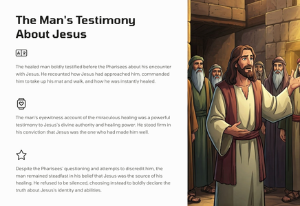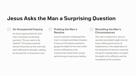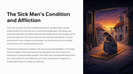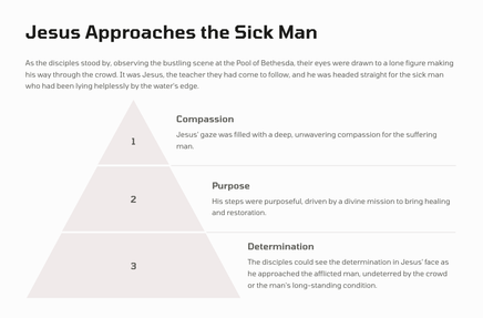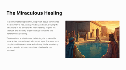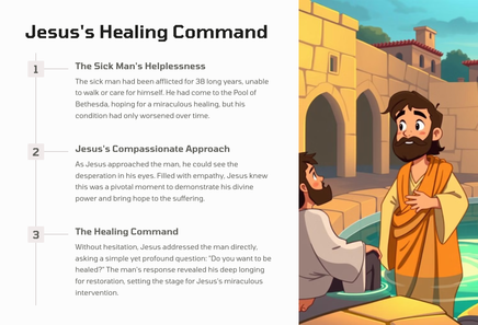 In Jerusalem, there was a pool called Bethesda, where many sick people would gather, waiting for the water to be stirred. One day, Jesus found a man who had been ill for 38 years, and he healed him, demonstrating his divine power and authority.