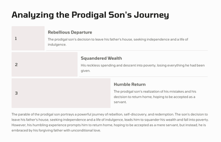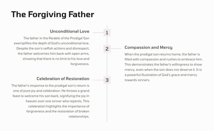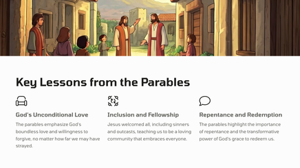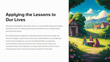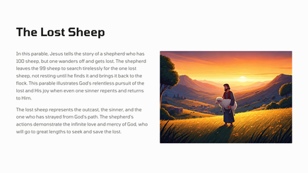 In this parable, Jesus tells the story of a shepherd who has 100 sheep, but one wanders off and gets lost. The shepherd leaves the 99 sheep to search tirelessly for the one lost sheep, not resting until he finds it and brings it back to the flock. This parable illustrates God's relentless pursuit of the lost and His joy when even one sinner repents and returns to Him.