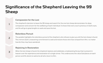 The lost sheep represents the outcast, the sinner, and the one who has strayed from God's path. The shepherd's actions demonstrate the infinite love and mercy of God, who will go to great lengths to seek and save the lost.
