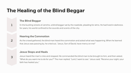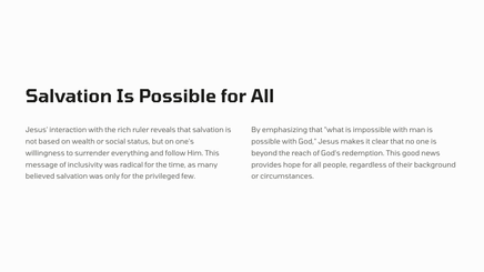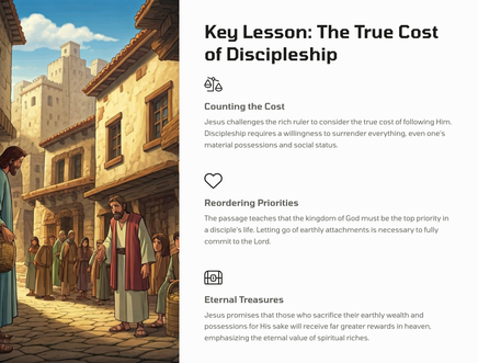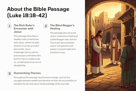 The ruler, blinded by his own riches, approaches Jesus to ask how he might inherit eternal life. Meanwhile, a poor, blind man sitting by the roadside cries out to Jesus, desperate for healing and restoration.