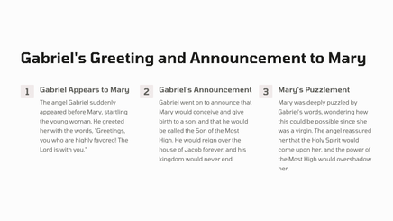 In the sixth month, the angel Gabriel was sent from God to a virgin named Mary, who was pledged to be married to a man named Joseph. The angel appeared to Mary and proclaimed that she would conceive and give birth to a son, the Son of God.
