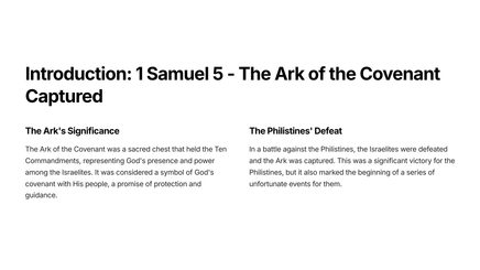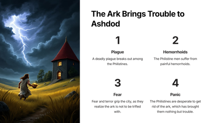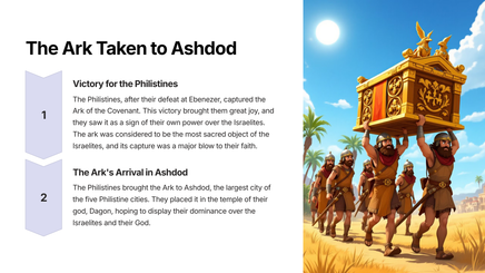 Experience the powerful story of 1 Samuel 5, where the Ark of God falls in the hands of the Philistines. Witness the consequences and lessons learned as the Philistines face the wrath of God. A must-read for those seeking to deepen their understanding of biblical history and faith.