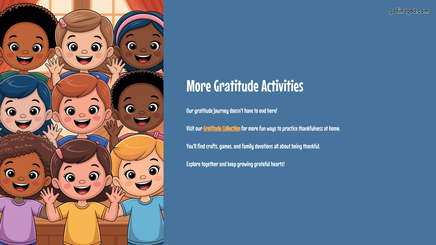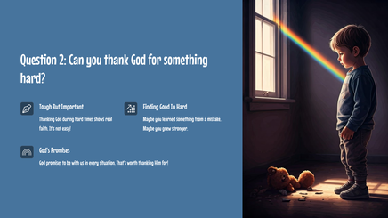 In this Day 1 devotional, children are introduced to the idea of gratitude in a way that’s meaningful and fun. Using 1 Thessalonians 5:18, kids will explore what it means to give thanks in all situations, reflect on their blessings, and learn that a grateful heart is a joyful heart.