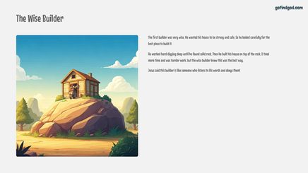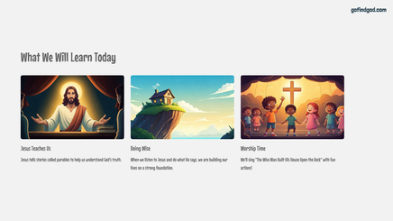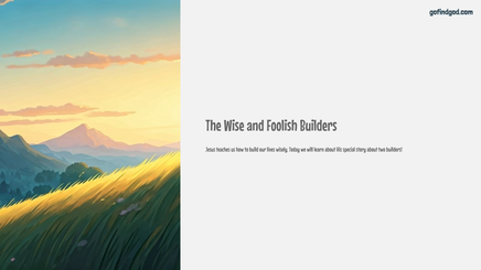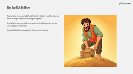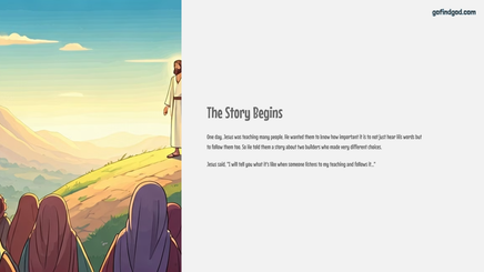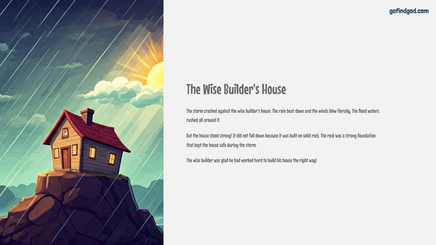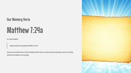 Read Matthew 7:24–27 from a children’s Bible or illustrated storybook. Use toy figures or visual props (e.g., rock, sand, house cut-outs) to act out the parable of the Wise and Foolish Builders. Emphasize the contrast between listening and ignoring Jesus’ words.