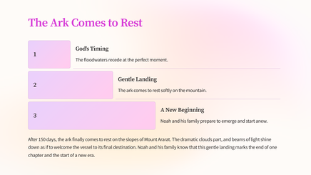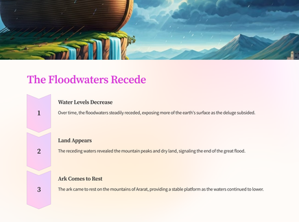 In this chapter, we learn how God brought an end to the great flood that had covered the earth. Through Noah's faithfulness, we discover important lessons about God's timing, mercy, and new beginnings.