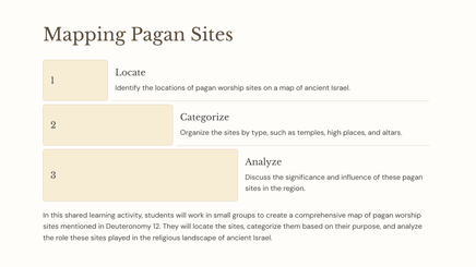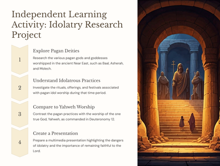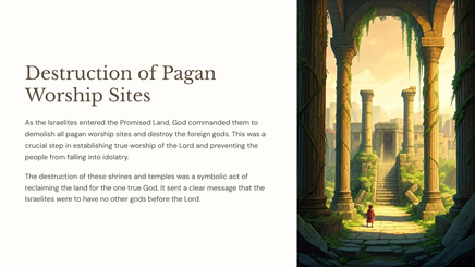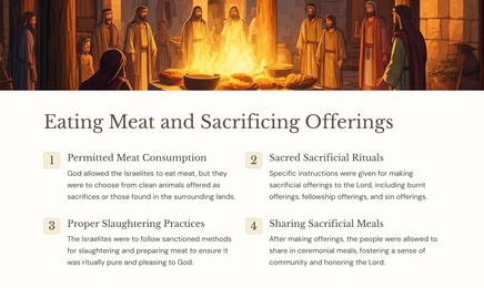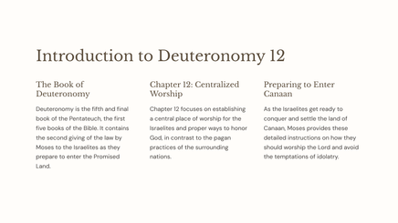 In this chapter, Moses lays out God's instructions for the Israelites on how to worship and serve Him in the Promised Land. Key themes include centralized worship, destroying pagan shrines, and offering proper sacrifices.