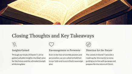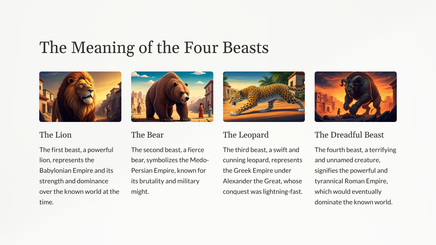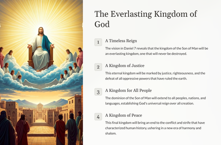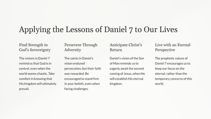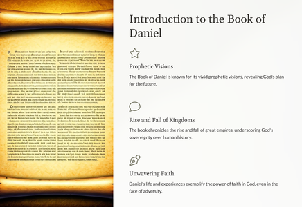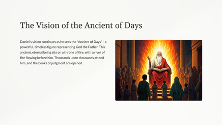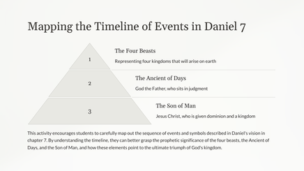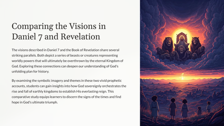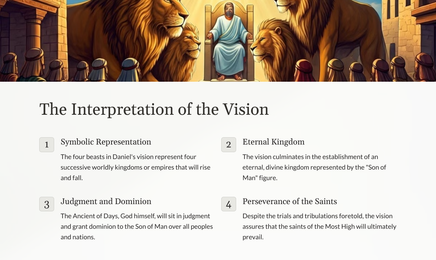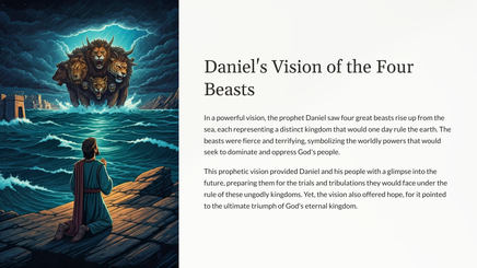 In this chapter from the Book of Daniel, the prophet receives a series of apocalyptic visions that foretell the rise and fall of powerful kingdoms and the eventual establishment of God's eternal kingdom.