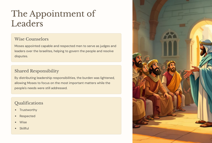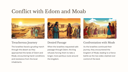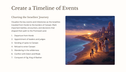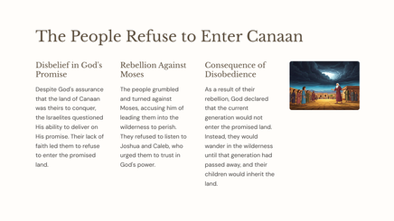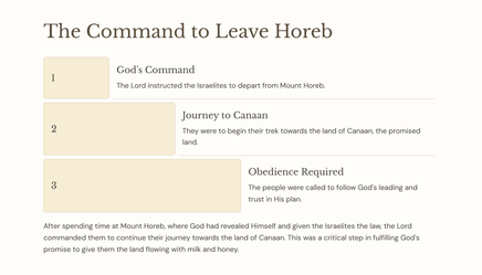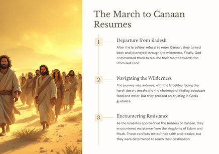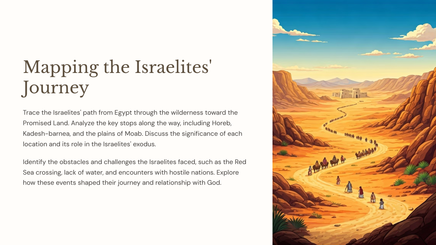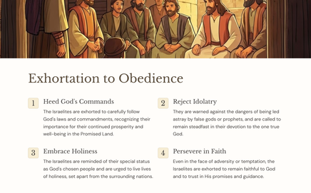 In the book of Deuteronomy, Moses recounts the Israelites' journey from Egypt to the border of the Promised Land of Canaan. He reminds the people of God's faithfulness and their need to obey His commands as they prepare to enter the land.